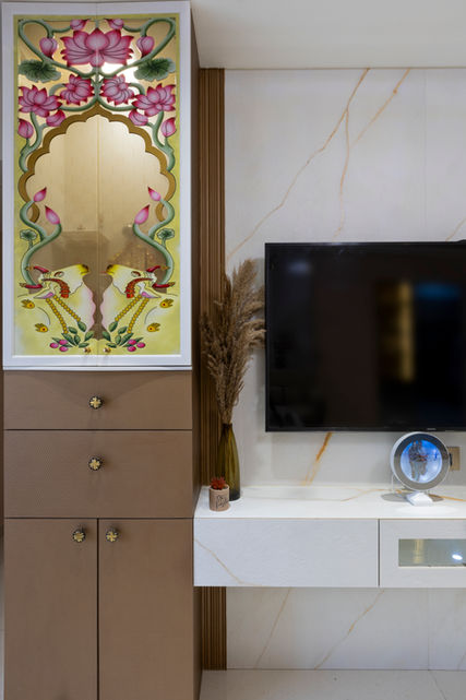 The area is anchored by a handcrafted Chhatrapati Shivaji Maharaj carpet, woven in the finest traditional Indian style, and accompanied by currency from Shivaji Maharaj’s era. This space exudes a sense of divinity and cultural richness, transporting you into a sacred realm.